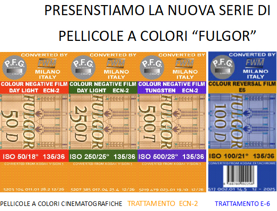 Punto Foto Group by KARL BIELSER s.a.s.in collaborazione con la nostra consociata, Fotografische Werke Mailand propone due linee di pellicole professionali provenienti da aziende leader e confezionate a Milano, da FWM con attrezzature, macchinari e know-how professionali in caricatori in metallo. La gamma: gothik XX-250 (Kodak Double-X) gothik RN-100 FULGOR 50D FULGOR 250D FULGOR 500T FILGOR EKTA 100D