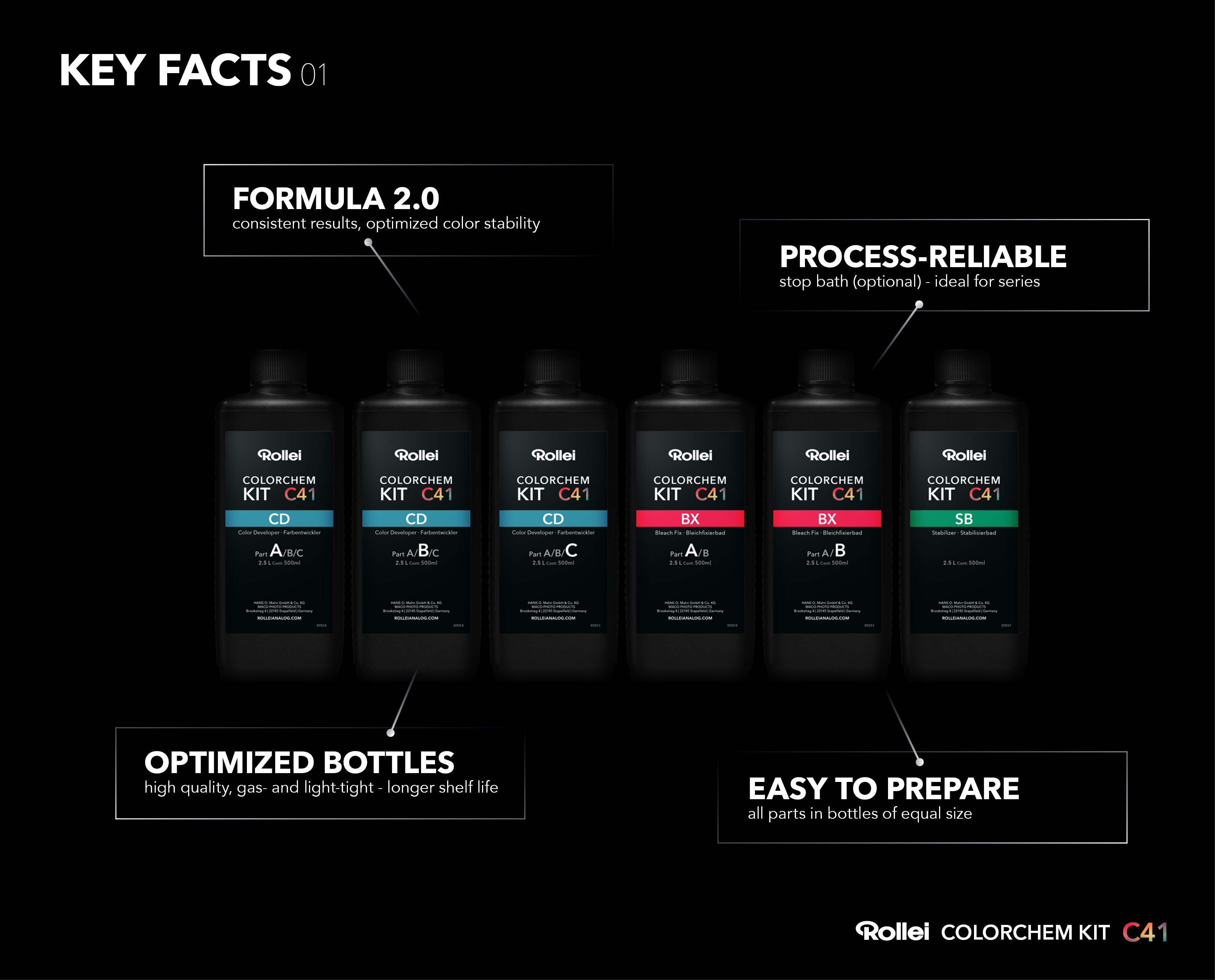 Questo kit di trattamento è adatto al trattamento di pellicole a colori negativo secondo il procedimento C-41 in sviluppatrici rotative (tipo Jobo), tank di sviluppo e drum. Il trattamento è possibile a 3 diverse temperature: