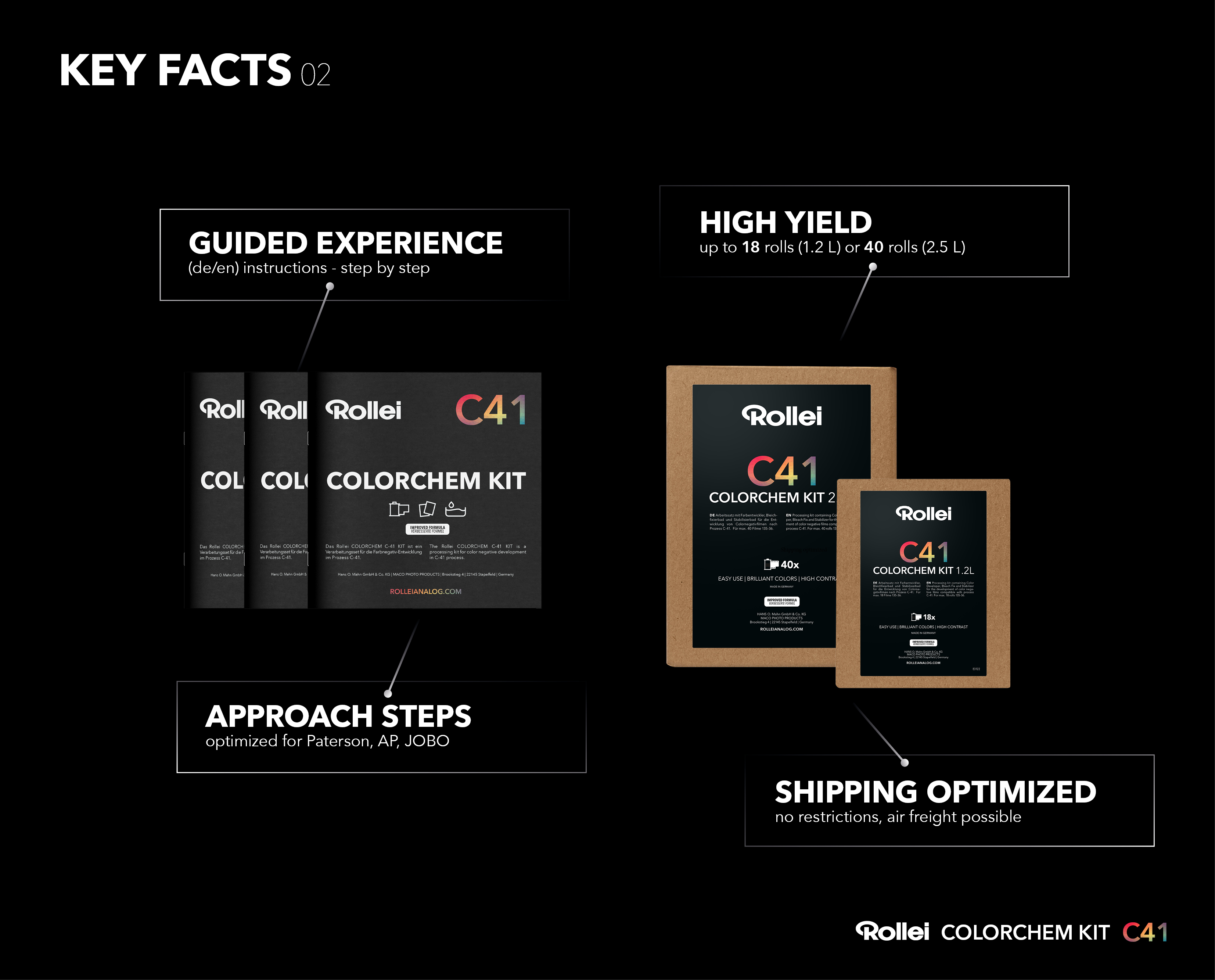Questo kit di trattamento è adatto al trattamento di pellicole a colori negativo secondo il procedimento C-41 in sviluppatrici rotative (tipo Jobo), tank di sviluppo e drum. Il trattamento è possibile a 3 diverse temperature: