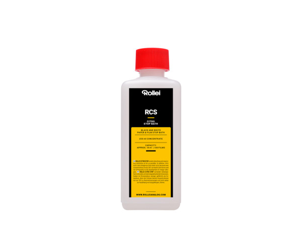 ROLLEI CITRO STOP acido citrico con indicatore al posto di acido acetico. Evita emissioni rilevanti e dannose alle vie respiratorie. Si inserisce un bagno d’arresto acido fra sviluppo efissaggio, d’un canto per neutralizzare gli alcali assunti dall’emulsione fotografica e interrompere l’azione dello sviluppo in modo efficace, dall’altro anche per non aumentare il valore pH delfissaggio e allungarne la durata. Diluizione 1+19